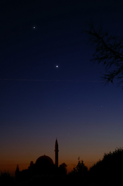 *flitz* schulligung. war beschäftigt :). aber jetzt bin ich da und … äh … hab eigentlich nur eins zum besten zu geben: heute grad vorher (also bei euch in ca. 5-6 stunden) in der dämmerung sind die zwei noch näher beieinander – und daneben gleich der hauchdünne sichelmond! das ist ein toller anblick – bei uns ist das wetter auch entsprechend.